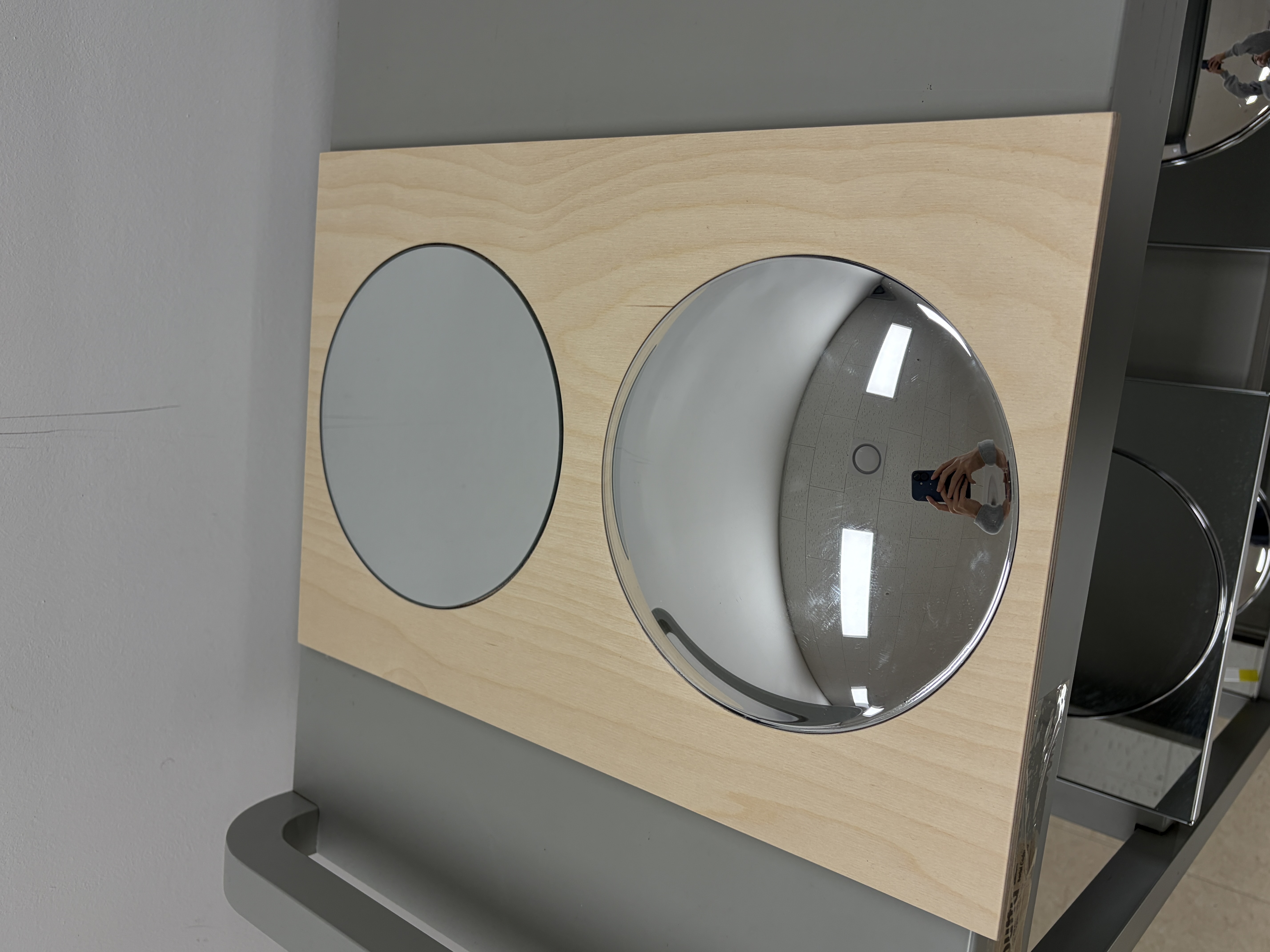 볼록거울 잔기스 多, 평면 원형 거울 모서리 불량, 프레임 볼록거울쪽 직선으로 난 나무결 체크해주세요