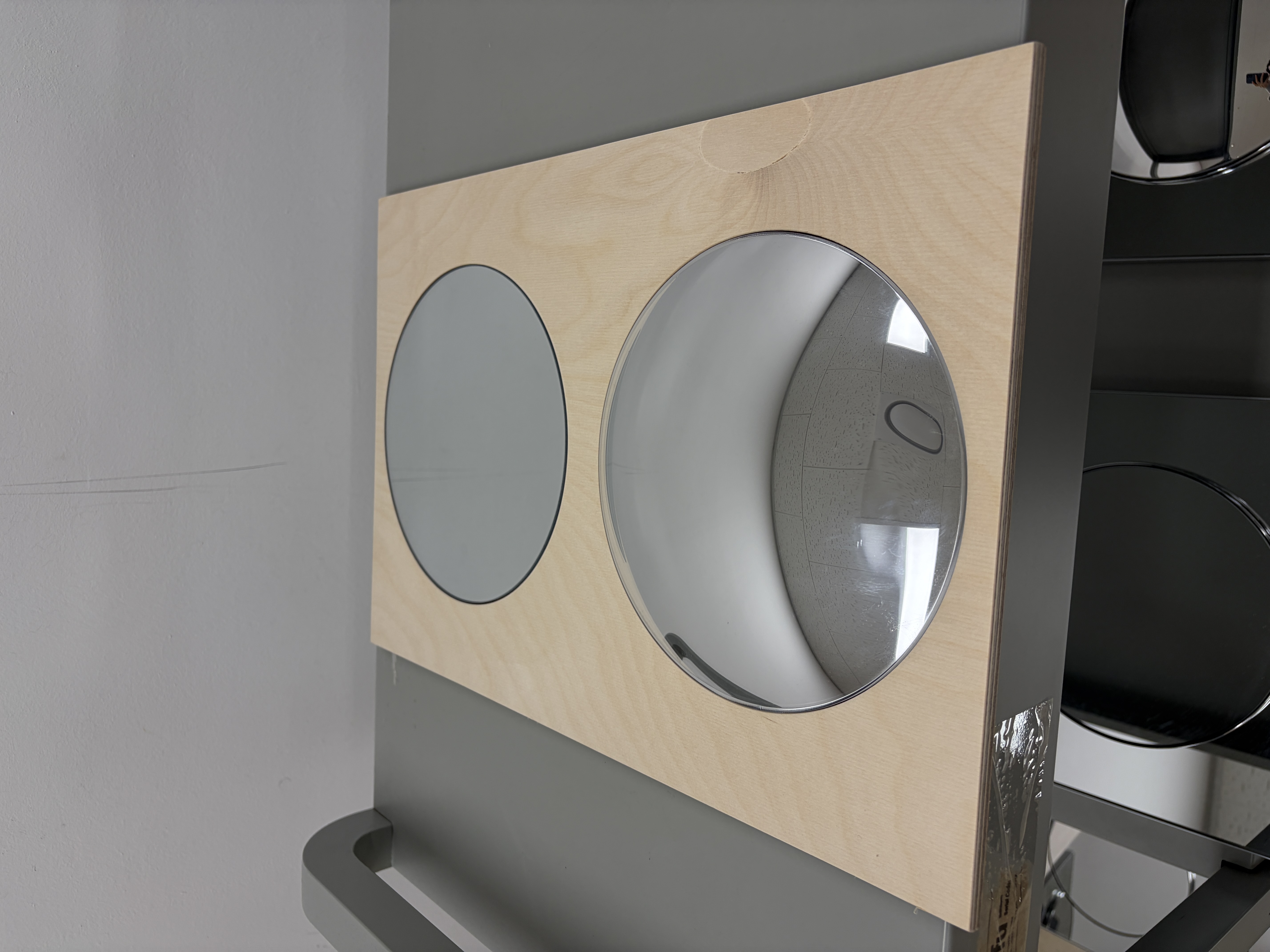 프레임 패치 자국으로 인해 불량, 평면 원형거울 모서리 불량, 볼록거울 하단부 성형 불량으로 인해 일렁거림 (중앙 이상없음)