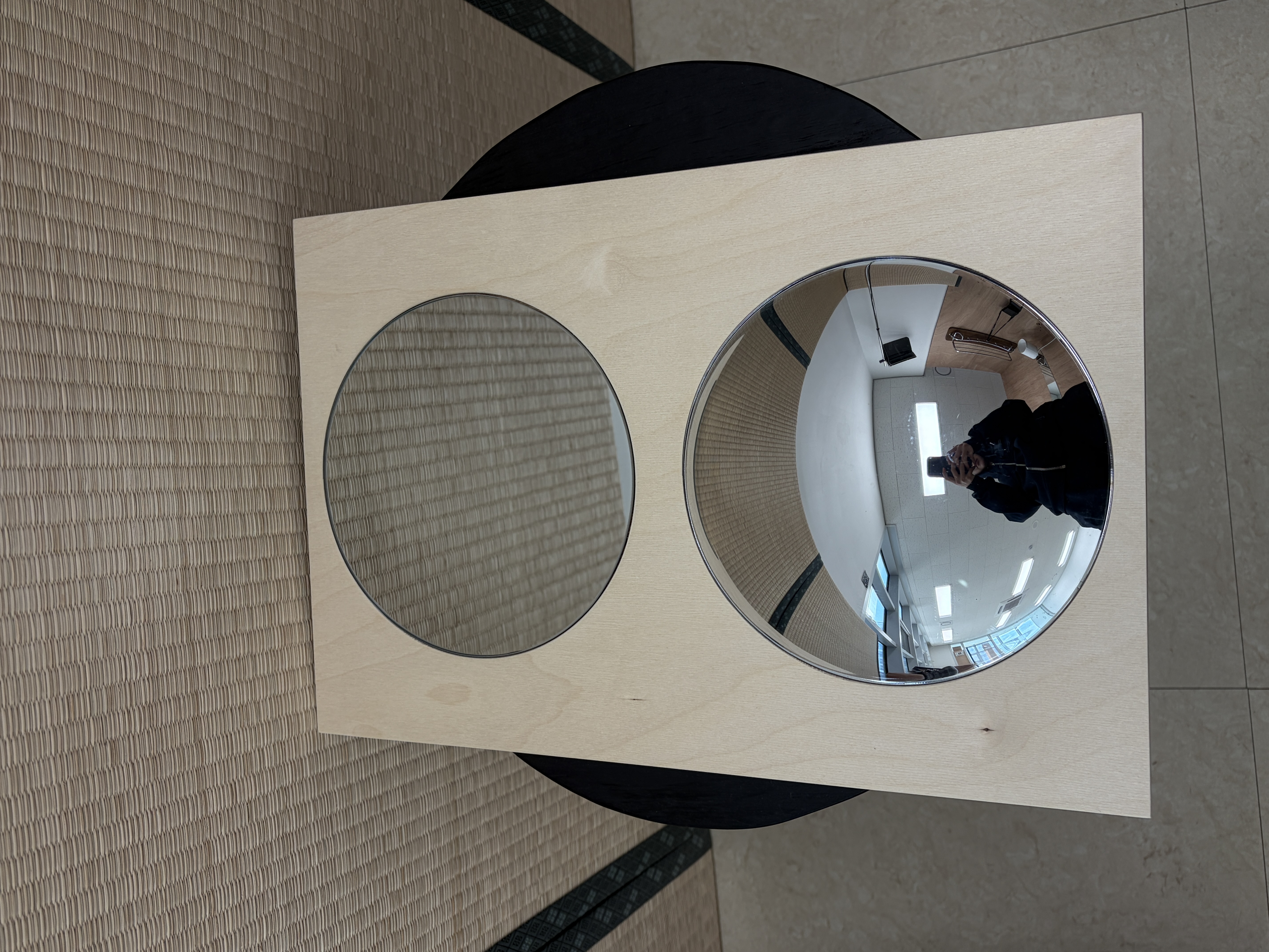 나무 결에 옹이 두개, 평면 원형거울 미세기스, 볼록거울 검은 반점, 벽걸이 세로 방향으로 걸어드려요.