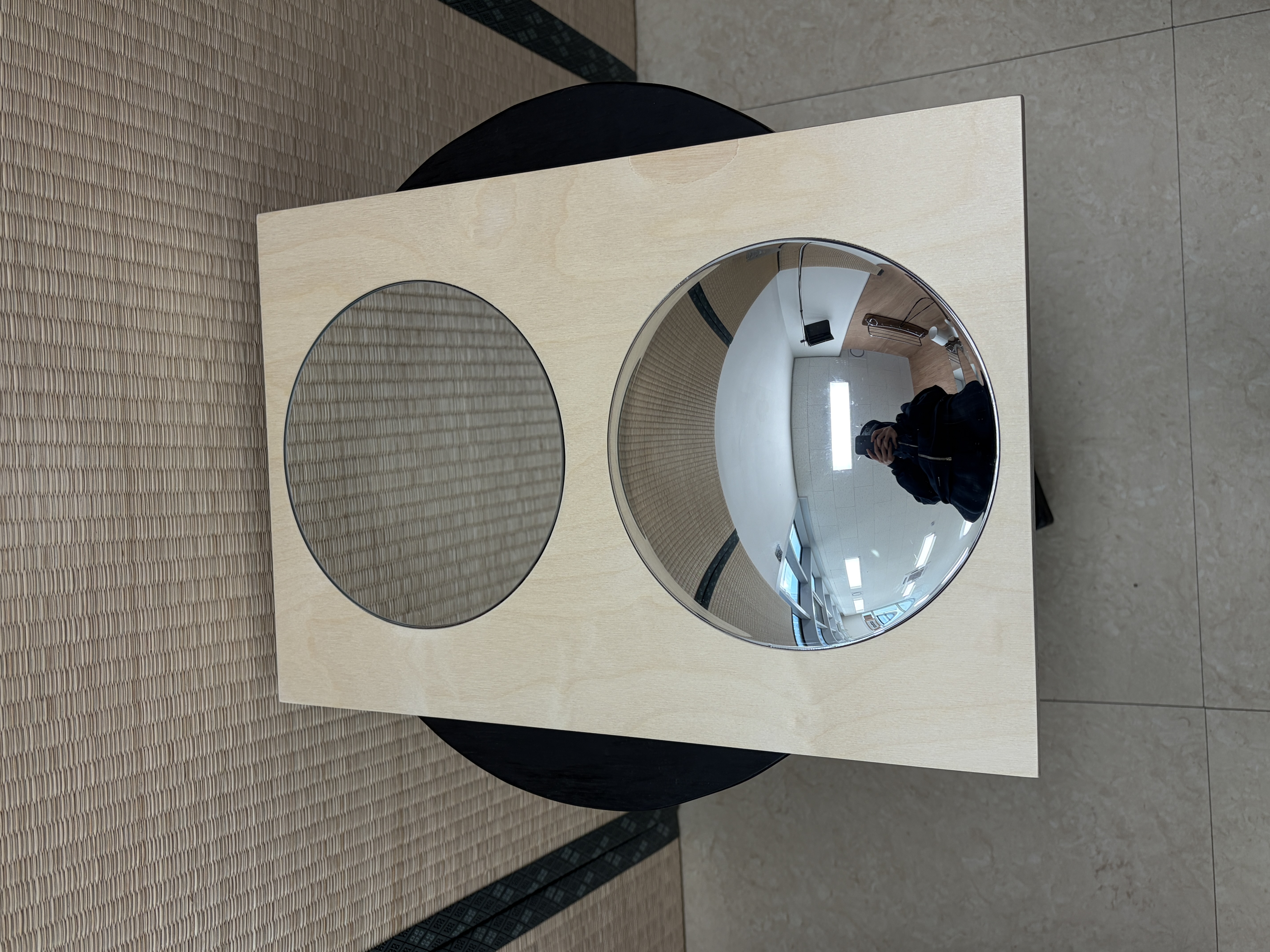 나무결 불량, 평면거울 기스 2개, 볼록거울 하단부 하얀기스 및 잔기스, 벽걸이 세로 방향으로 걸어드려요.