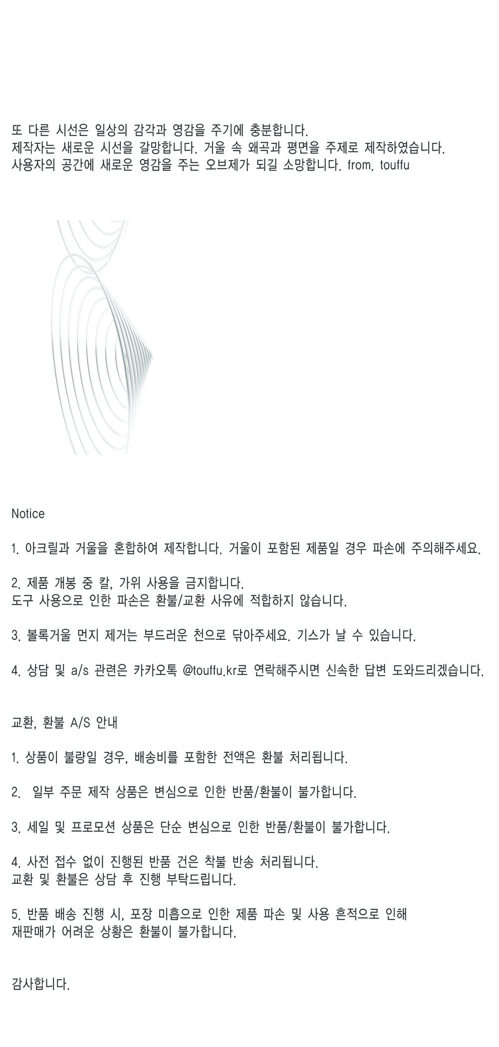 * 모니터 해상도에 따라 색상이 다르게 보일 수 있습니다. * 볼록 거울 제작 과정시 반점이나, 미세한 스크래치가 있을 수 있습니다. * 디자인 특허 및 등록 완료 된 제품입니다.